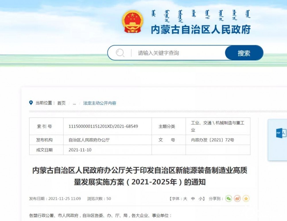 內(nèi)蒙古自治區(qū)人民政府辦公廳關(guān)于印發(fā)自治區(qū)新能源裝備制造業(yè)高質(zhì)量發(fā)展實(shí)施方案(2021-2025年)的通知