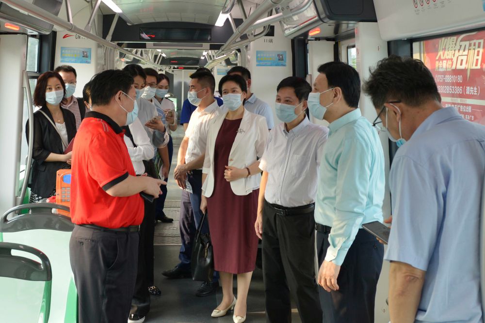 左一張娟董事長帶領(lǐng),左二許國先生、右一馬東生先生、右二余主席、右三程一兵院士一行實(shí)地體驗(yàn)了高明氫能有軌電車示范線