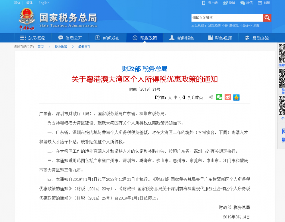 《關于粵港澳大灣區(qū)個人所得稅優(yōu)惠政策的通知》(財稅〔2019〕31號)