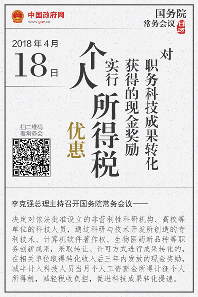 4月18日,李克強主持國務(wù)院常務(wù)會議決定,在落實好科技人員股權(quán)獎勵遞延納稅優(yōu)惠政策的同時,對因職務(wù)科技成果轉(zhuǎn)化獲得的現(xiàn)金獎勵給予稅收優(yōu)惠。對依法批準(zhǔn)設(shè)立的非營利性科研機構(gòu)、高校等單位的科技人員,通過科研與技術(shù)開發(fā)所創(chuàng)造的專利技術(shù)、計算機軟件著作權(quán)、生物醫(yī)藥新品種等職務(wù)創(chuàng)新成果,采取轉(zhuǎn)讓、許可方式進行成果轉(zhuǎn)化的,在相關(guān)單位取得轉(zhuǎn)化收入后三年內(nèi)發(fā)放的現(xiàn)金獎勵,減半計入科技人員當(dāng)月個人工資薪金所得計征個人所得稅。