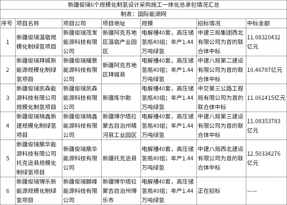 就在4月15日,另一個俊瑞字頭的項目公布了設(shè)計采購施工一體化總承包中標(biāo)公告:新疆俊瑞楠鑫新建規(guī)?;凭G氫項目設(shè)計采購施工一體化總承包中標(biāo)結(jié)果顯示,中建八局第三建設(shè)有限公司為牽頭單位的聯(lián)合體中標(biāo),中標(biāo)金額11.08353783億元。
