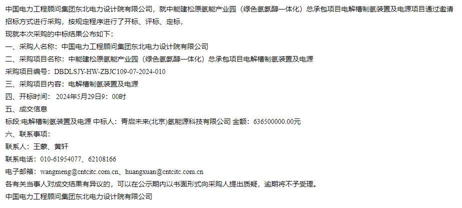 信息顯示:中標人為青啟未來(北京)氫能源科技有限公司,金額為636500000.00元。