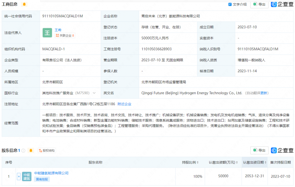 企查查信息顯示,青啟未來(北京)氫能源科技有限公司為中能建氫能源有限公司全資產(chǎn)業(yè)公司。