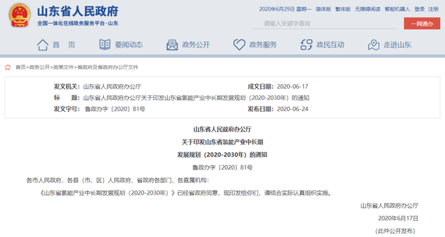 6月24日,山東省政府辦公廳正式發(fā)布了《山東省氫能產(chǎn)業(yè)中長期發(fā)展規(guī)劃(2020-2030年)》(以下簡稱《規(guī)劃》)?!兑?guī)劃》文件對山東省氫能產(chǎn)業(yè)的發(fā)展目標(biāo)、發(fā)展路徑和空間布局、重點發(fā)展任務(wù)、環(huán)境評價影響、保障措施等6個方面做了詳細(xì)介紹。