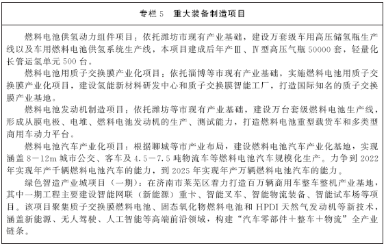 2.布局兩大集群。形成以濰坊、淄博市為龍頭的燃料電池及關(guān)鍵材料產(chǎn)業(yè)集群和以聊城、濟(jì)寧市為龍頭的燃料電池整車及氫能制儲裝備產(chǎn)業(yè)集群。其中,濰坊市重點打造世界領(lǐng)先的燃料電池發(fā)動機(jī)制造基地,淄博市重點打造燃料電池關(guān)鍵材料及核心部件產(chǎn)業(yè)基地,聊城市重點打造燃料電池整車研發(fā)制造基地,濟(jì)寧市重點打造氫能制取儲運裝備產(chǎn)業(yè)基地。