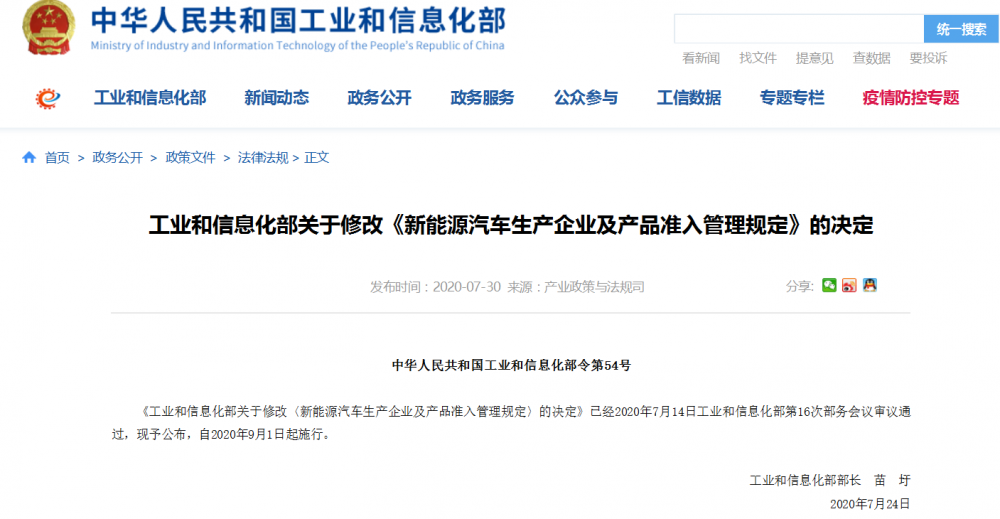 2020年7月24日,工業(yè)和信息化部公布了《工業(yè)和信息化部關(guān)于修改<新能源汽車生產(chǎn)企業(yè)及產(chǎn)品準入管理規(guī)定>的決定》(工業(yè)和信息化部令第54號,下稱《決定》)。為了更好地理解和執(zhí)行《決定》,工業(yè)和信息化部產(chǎn)業(yè)政策與法規(guī)司負責(zé)人對《決定》進行了解讀。
