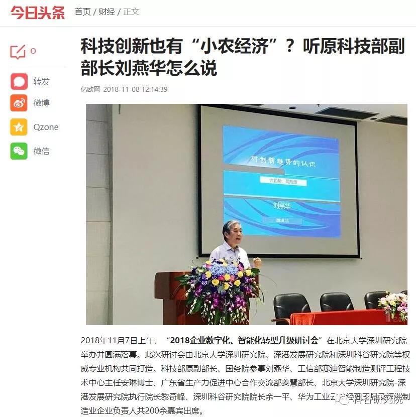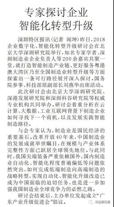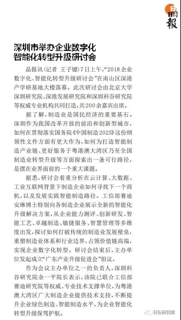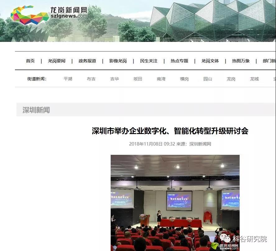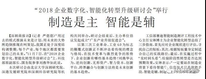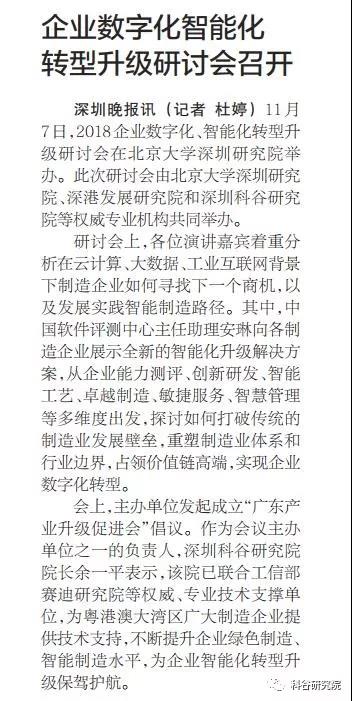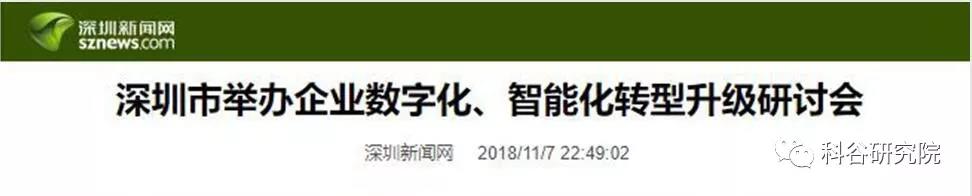11月7日,由深圳科谷研究院、北京大學深圳研究院和深港發(fā)展研究院等權(quán)威專業(yè)機構(gòu),共同打造的2018企業(yè)數(shù)字化-智能化轉(zhuǎn)型升級研討會圓滿落幕,受到與會嘉賓的一致好評,《深圳特區(qū)報》、《深圳特區(qū)報》、《深圳晚報》、《晶報》、“深圳衛(wèi)視”、“深圳財經(jīng)生活頻道”及“今日頭條”、“億歐網(wǎng)”等媒體均作了重點報道。