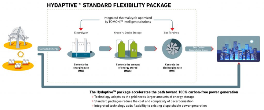 三菱發(fā)電公司推出的解決方案包括Hydaptive套件和Hystore套件。Hydaptive軟件旨在通過近乎瞬時(shí)的功率平衡資源來提供可再生能源的靈活性,從而極大地增強(qiáng)了簡單循環(huán)或聯(lián)合循環(huán)電廠增/減功率的能力來加強(qiáng)電網(wǎng)平衡服務(wù)的能力。它將燃?xì)廨啓C(jī)發(fā)電廠與電解制氫裝置集成在一起,同時(shí)結(jié)合現(xiàn)場氫氣存儲,從而生產(chǎn)100%可再生電力。