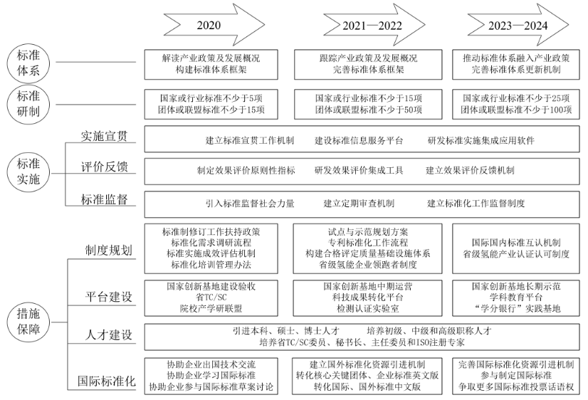 具體而言,標(biāo)準(zhǔn)化路線圖分2020年、2021—2022年和2023—2024年三個(gè)時(shí)間段,從標(biāo)準(zhǔn)體系、標(biāo)準(zhǔn)研制、標(biāo)準(zhǔn)實(shí)施和保障措施四個(gè)方面進(jìn)行闡述。標(biāo)準(zhǔn)體系主要是構(gòu)建符合廣東省氫燃料電池汽車產(chǎn)業(yè)發(fā)展的標(biāo)準(zhǔn)體系結(jié)構(gòu)圖,并不斷完善改進(jìn)。標(biāo)準(zhǔn)研制是根據(jù)技術(shù)成熟度和資源稟賦條件,制定多個(gè)層次的標(biāo)準(zhǔn)文本,補(bǔ)充完善標(biāo)準(zhǔn)體系下的標(biāo)準(zhǔn)。標(biāo)準(zhǔn)實(shí)施主要是開展標(biāo)準(zhǔn)宣貫、標(biāo)準(zhǔn)評價(jià)反饋、標(biāo)準(zhǔn)監(jiān)督等工作。措施保障是從制度規(guī)劃、平臺建設(shè)、人才建設(shè)和國際標(biāo)準(zhǔn)化四個(gè)方面,闡述標(biāo)準(zhǔn)體系和規(guī)劃路線圖實(shí)施的支撐。
