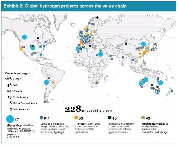 全球正加速投資布局氫能項(xiàng)目。目前,在全球范圍內(nèi),價(jià)值鏈上有228個(gè)氫項(xiàng)目,85%的全球項(xiàng)目來(lái)自歐洲、亞洲和澳大利亞,美洲、中東和北非正在加速部署。在這些項(xiàng)目中有17個(gè)GW級(jí)項(xiàng)目(即可再生能源超過(guò)1GW,每年可產(chǎn)20萬(wàn)噸低碳?xì)洌?,其中最大的?xiàng)目在歐洲、澳大利亞、中東和智利。