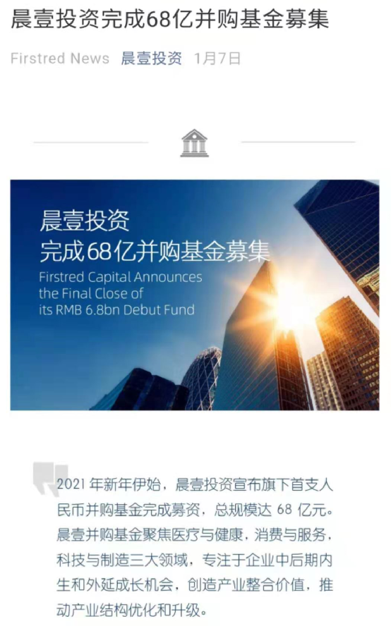 今年1月初,晨壹投資在其微信公眾號宣布,已完成旗下首支人民幣并購基金募資,總規(guī)模達68億元。其首期基金主要出資人以機構投資者為主,不僅覆蓋大型保險公司、知名母基金、上市公司等,還有多家龍頭企業(yè)的創(chuàng)始人、核心高管或其家族辦公室參與其中。