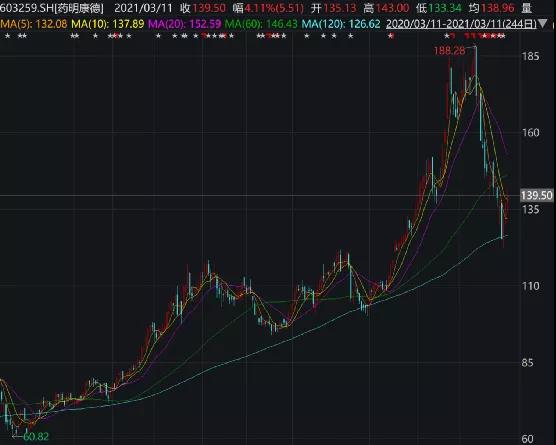 藥明康德是全球領先的制藥以及醫(yī)療器械研發(fā)開放式能力和技術平臺企業(yè),A股有名的醫(yī)療外包行業(yè)龍頭公司,大白馬、基金重倉,它同時也在港股上市。近一年藥明康德漲勢凌厲,今年2月股價最高漲至188.28元,但最近調(diào)整也比較劇烈,截至3月11日收盤,藥明康德報收139.50元,最新總市值為3389億元。