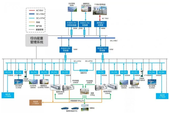 示范工程將建成世界首個電-氫-熱-車耦合的±10千伏直流互聯(lián)系統(tǒng)。包含——可再生能源發(fā)電總功率超過3兆瓦,制氫功率400千瓦,電池儲能總?cè)萘看笥?兆瓦/3兆瓦時;